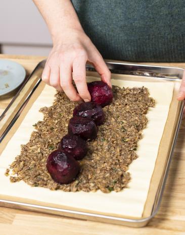 2. Nun setze die Roten Beten mittig auf den verteilten Pilz-Mix und drücke sie leicht an. Jetzt gib den Rest der Duxelles auf die Roten Beten.